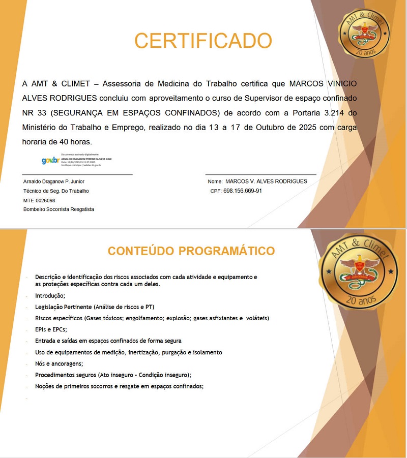 CERTIFICADO NR-33 SUPERVISOR ESPAÇO CONFINADO